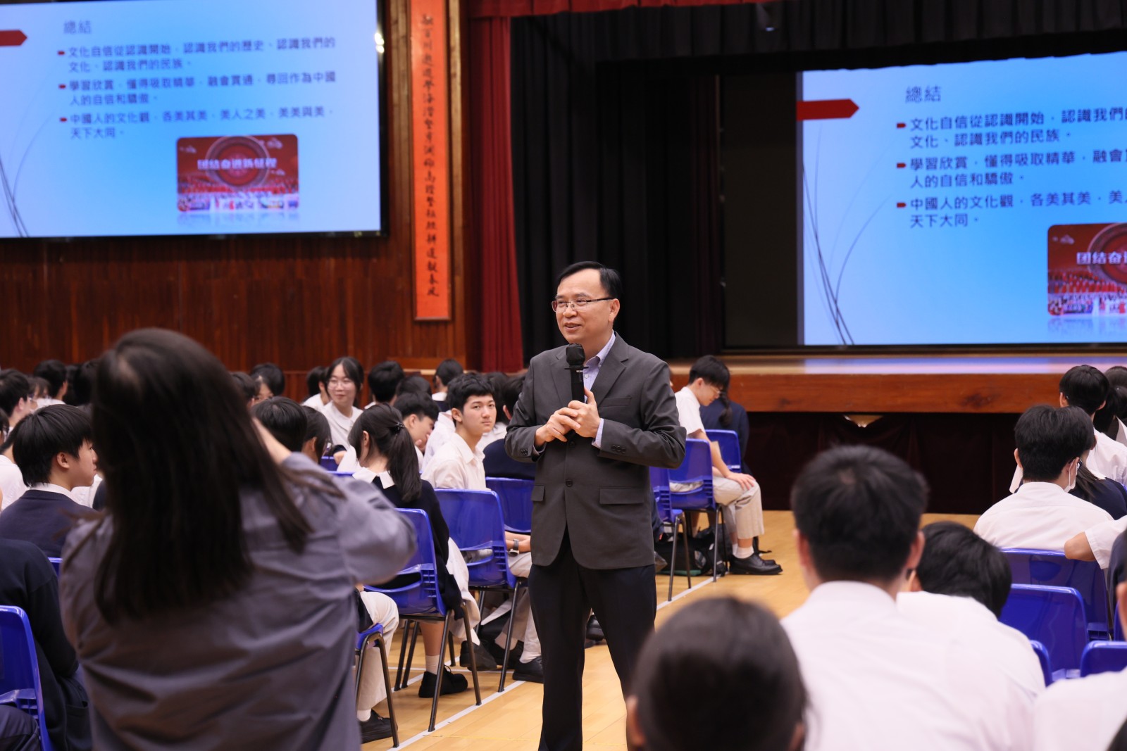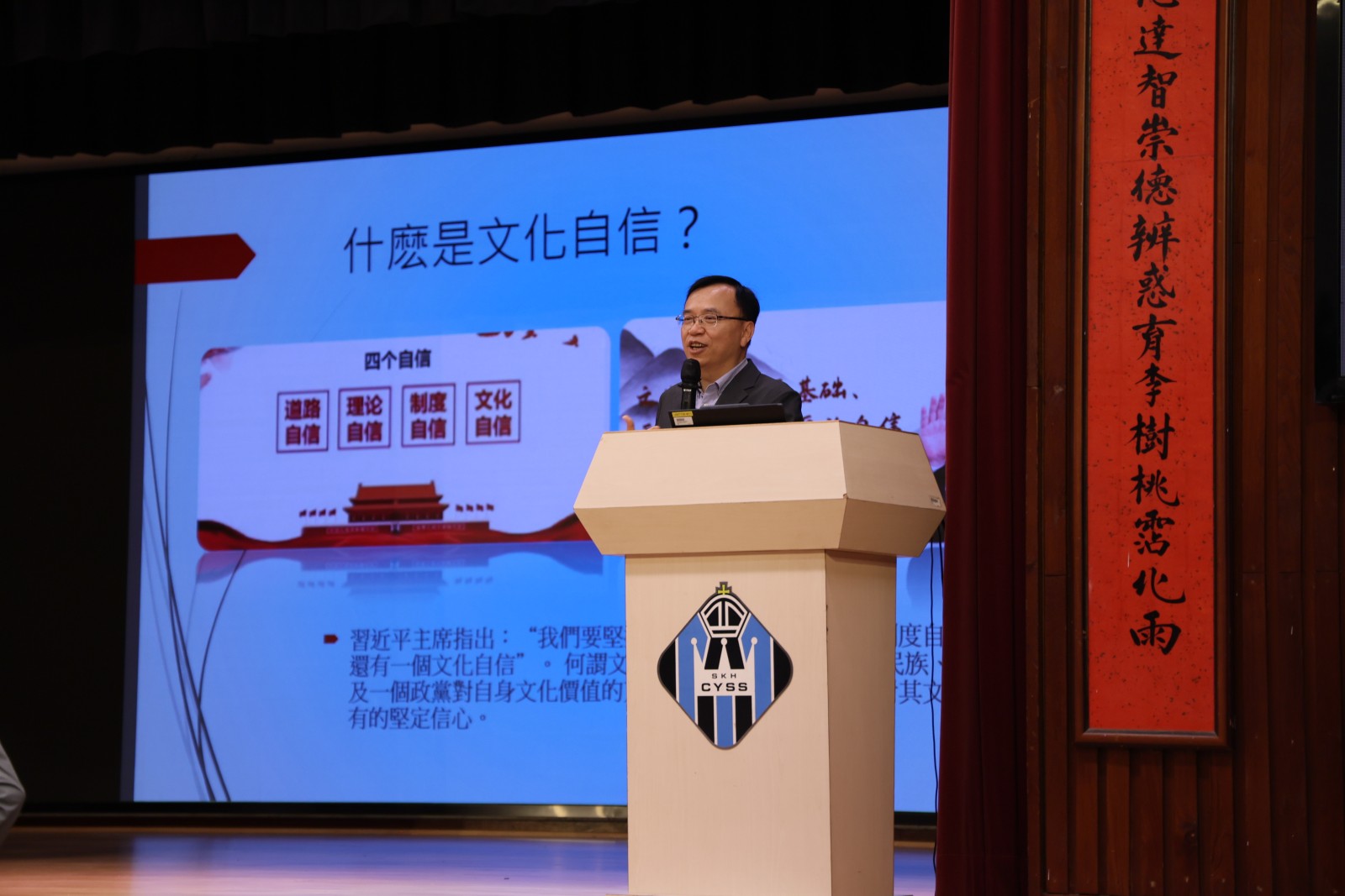本校公民與社會發展科有幸經香港友好協進會邀得全國政協提案委員會副主任、工聯會理事長、立法會議員黃國先生, BBS, JP 蒞臨於9月25日全方位學習課,與中四及中五全體同學分享「從中華文明看中國人的文化自信」,講解文化自信是一個民族、一個國家以及一個政黨對自身文化價值的充分肯定和積極實踐,並對其文化的生命力持有堅定信心。