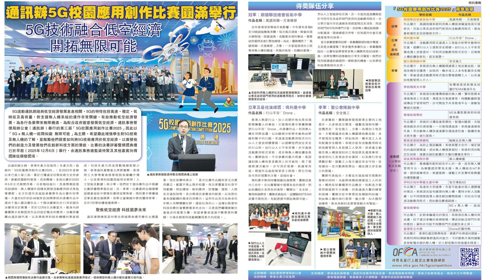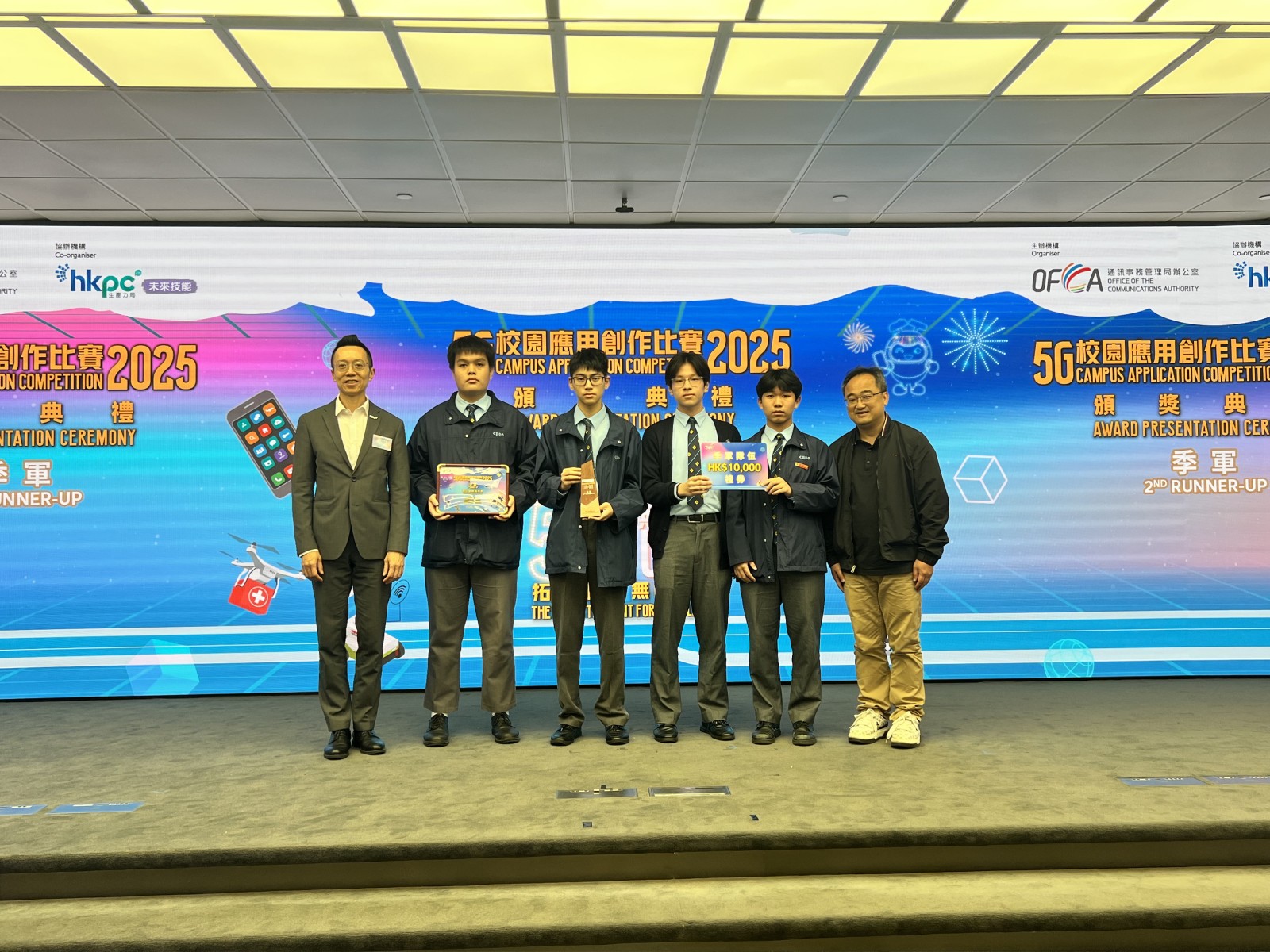 We proudly announce that a team of four students has won 2nd Runner-up in the territory-wide 5G Campus Application Creation Competition 2025, organized by the Office of the Communications Authority (OFCA) and implemented by the Hong Kong Productivity Council (HKPC), standing out among 48 participating school teams across Hong Kong. This achievement recognizes their innovative use of 5G, AI, drones and app development to enhance safety on construction sites.