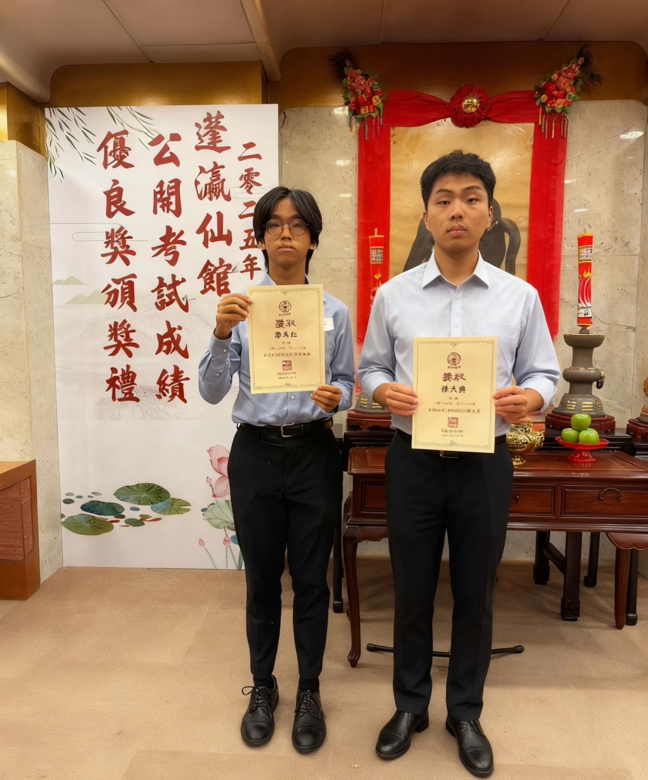 本校2025年度畢業生潘浩仁同學及張天樂同學,憑藉其在香港中學文憑試的卓越表現,榮獲蓬瀛仙館「第三十四屆 (2025年) 香港公開考試成績優良獎」。頒獎典禮已於2025年11月9日假座蓬瀛仙館圓滿舉行,兩位校友均獲頒獎學金及獎狀,以茲表彰。蓬瀛仙館自1992年起設立此獎項,旨在鼓勵學生努力求學,樹立優良榜樣。