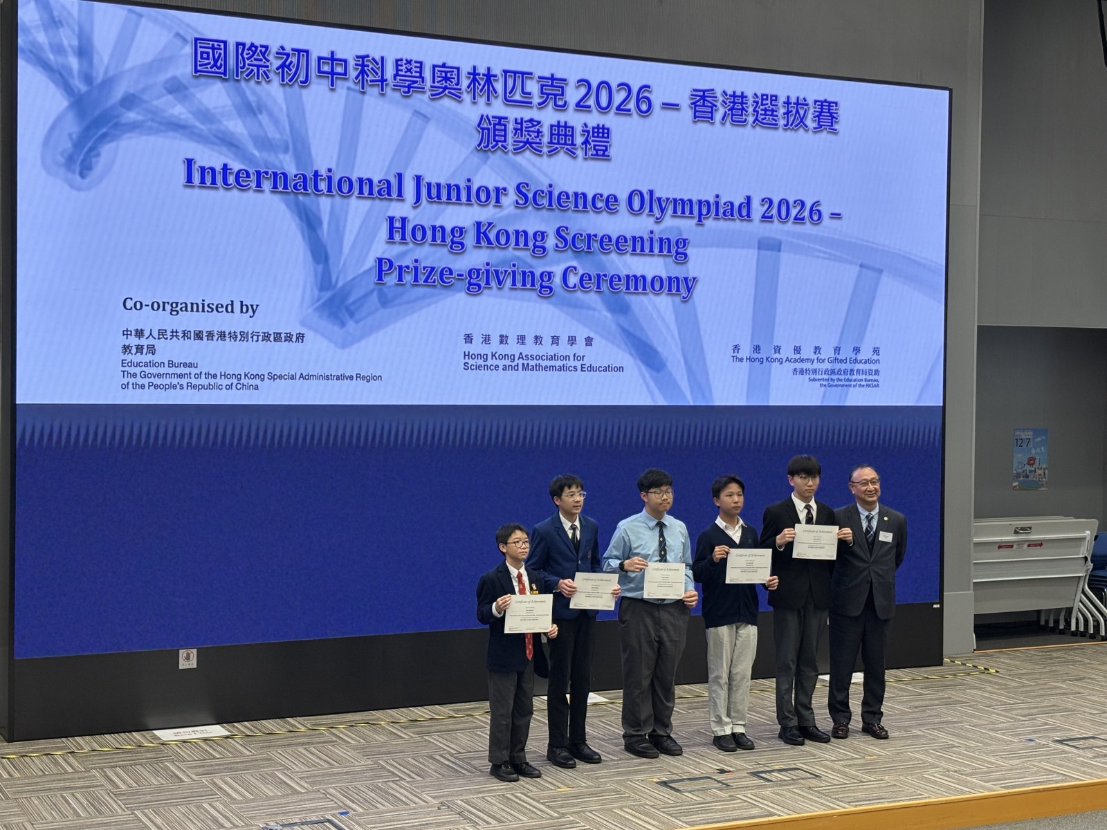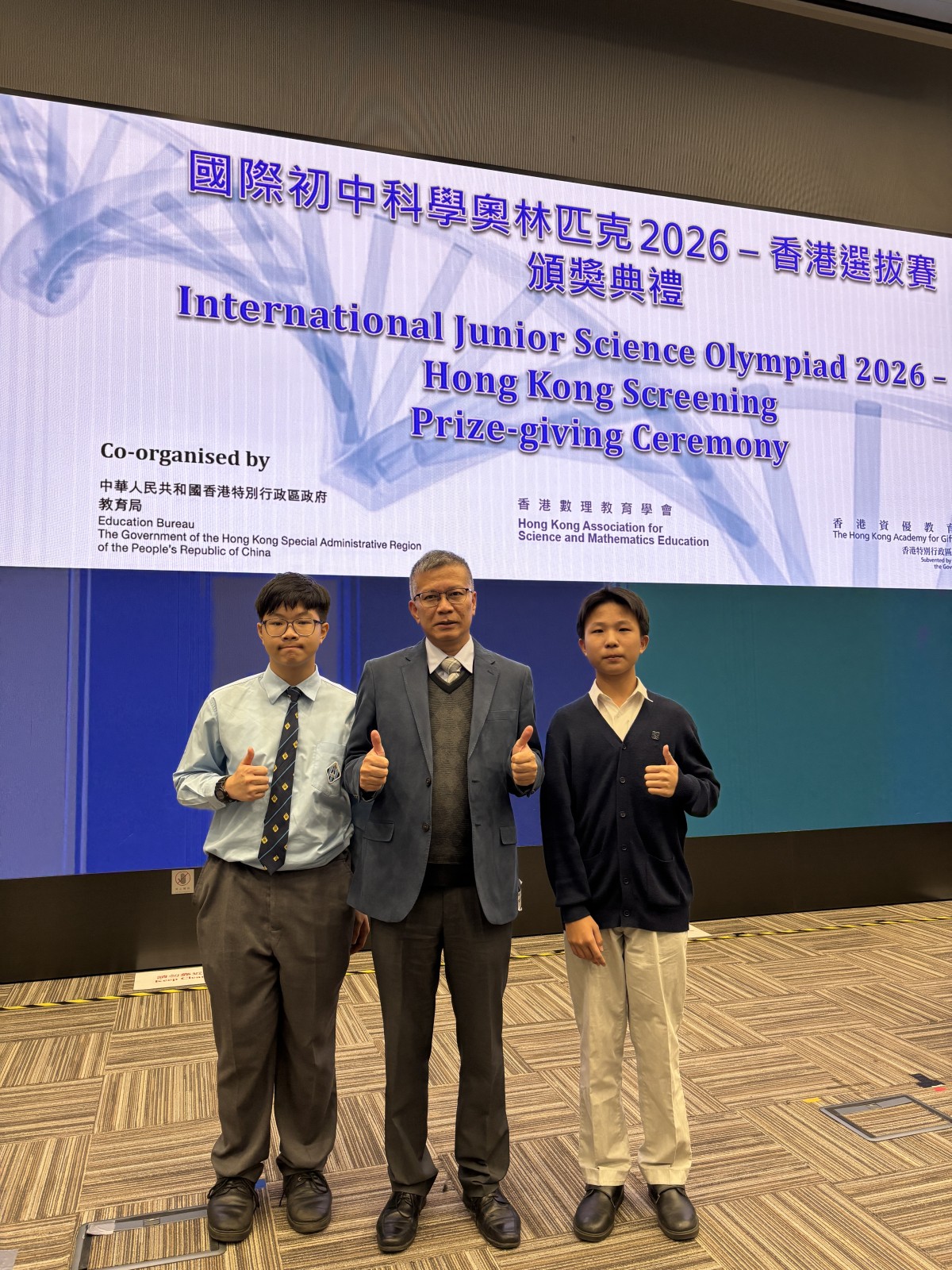 The IJSO 2026 – Hong Kong Screening was co-organised by the Education Bureau, the Hong Kong Academy for Gifted Education, and the Hong Kong Association for Science and Mathematics Education. After the screening, two of our S.3 students, Luo Friendy and Luo Pang Yu, were awarded the Second Class Honours.